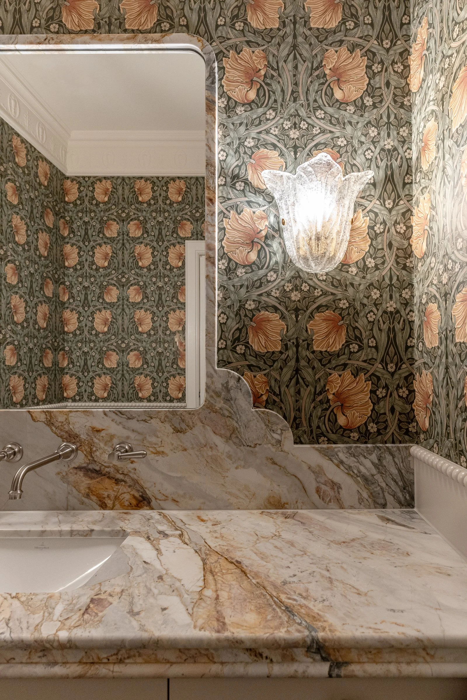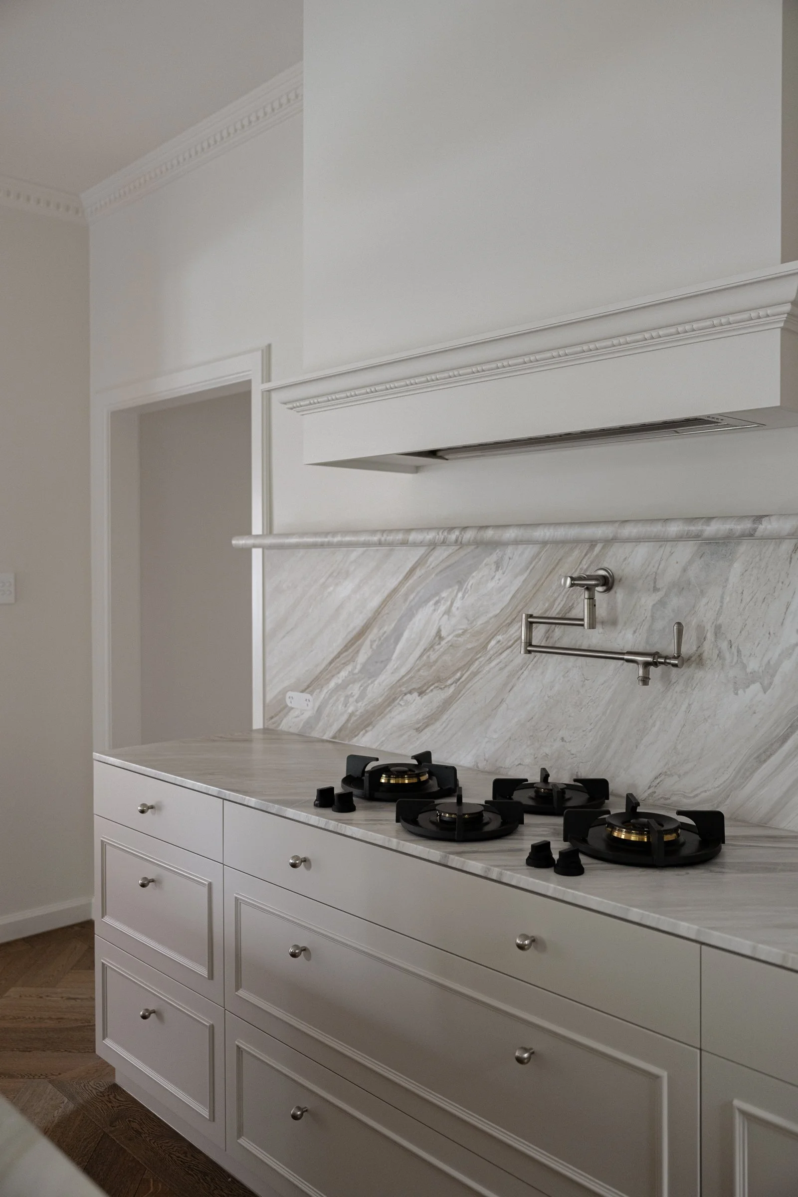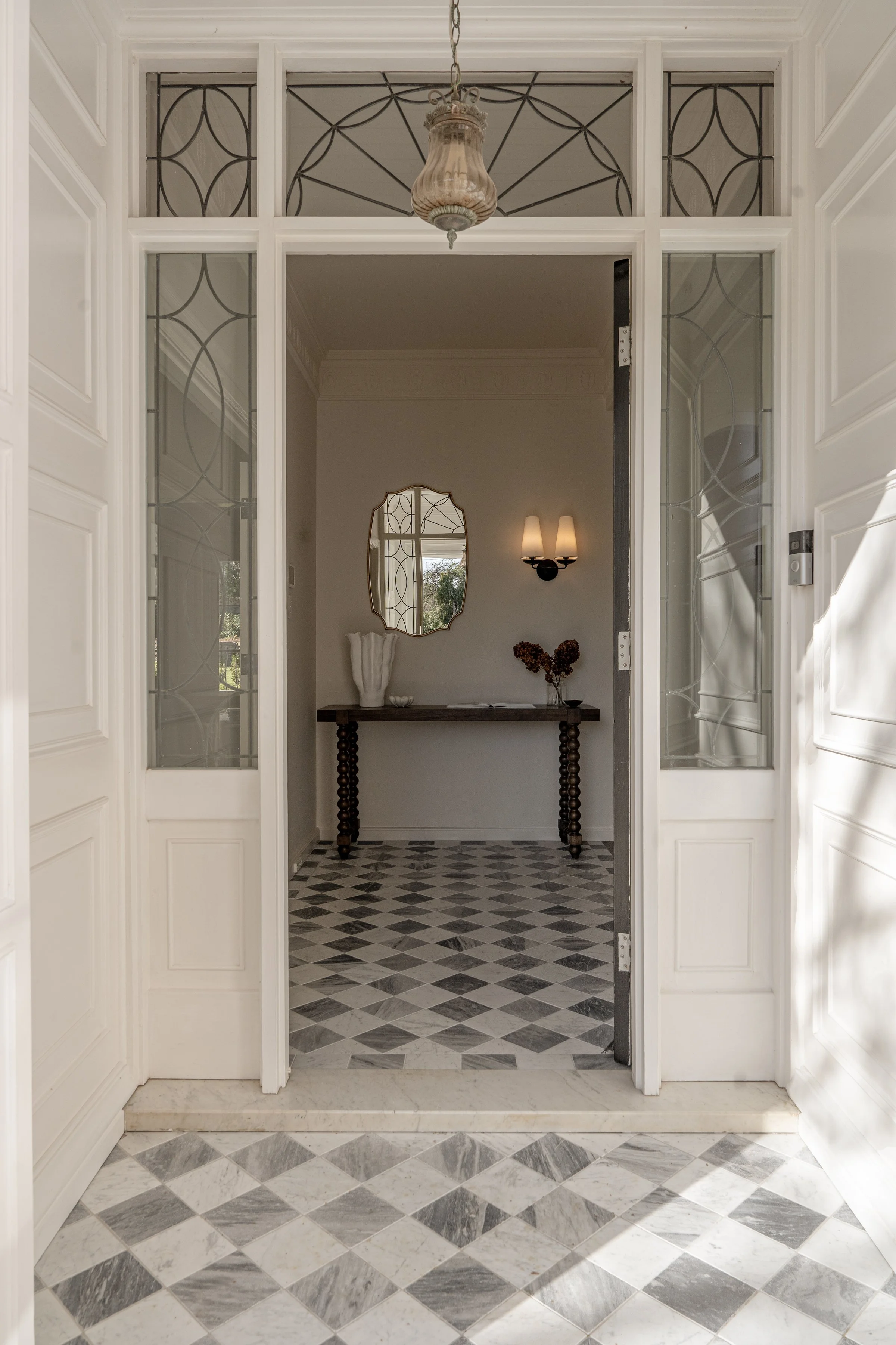 The redesign introduced a more intuitive flow while maintaining formal character. Alchemists ID refined the interiors with tailored layouts, bespoke joinery, and curated finishes for a family who loves to entertain and host. Highlights include a guest bathroom with a concealed ensuite and a material palette that balances timeless elegance with bold, playful details.